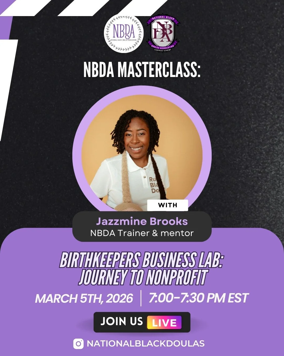 NBDA® Masterclasses are 30-minute, expert-led sessions streamed live on Instagram and YouTube. These sessions are designed to educate, empower, and inform Black families and communities within the birth space. Through accessible, culturally grounded, and evidence-based guidance on maternal health, advocacy, and wellness, we support informed decision-making, uplift trusted voices, and strengthen NBDA®'s leadership in Black maternal health education