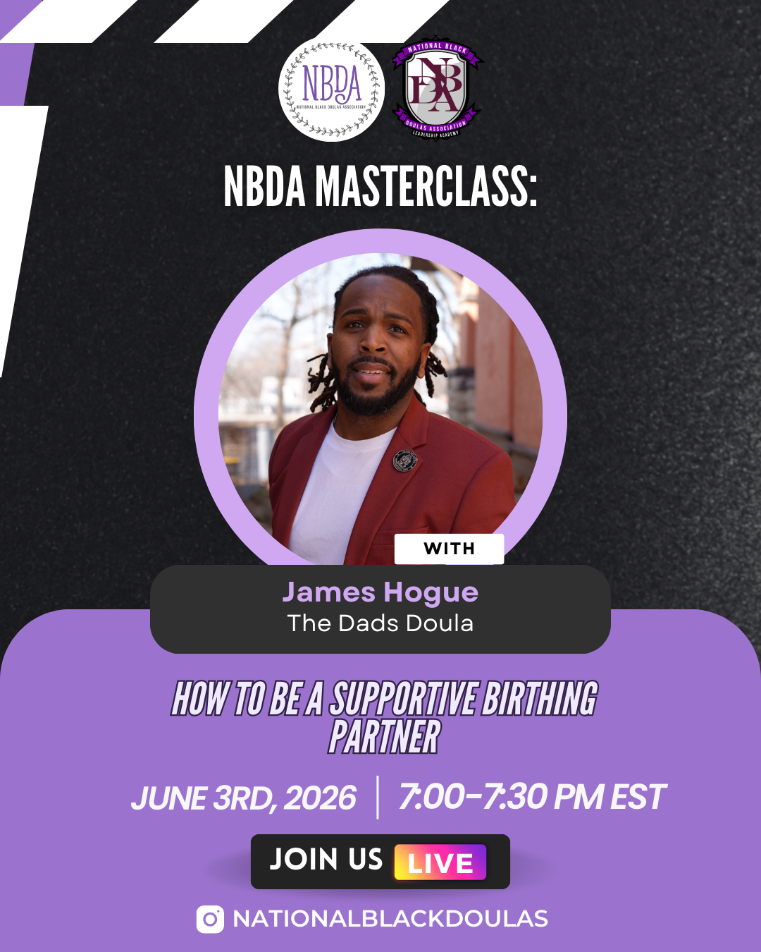 NBDA® Masterclasses are 30-minute, expert-led sessions streamed live on Instagram and YouTube. These sessions are designed to educate, empower, and inform Black families and communities within the birth space. Through accessible, culturally grounded, and evidence-based guidance on maternal health, advocacy, and wellness, we support informed decision-making, uplift trusted voices, and strengthen NBDA®'s leadership in Black maternal health education