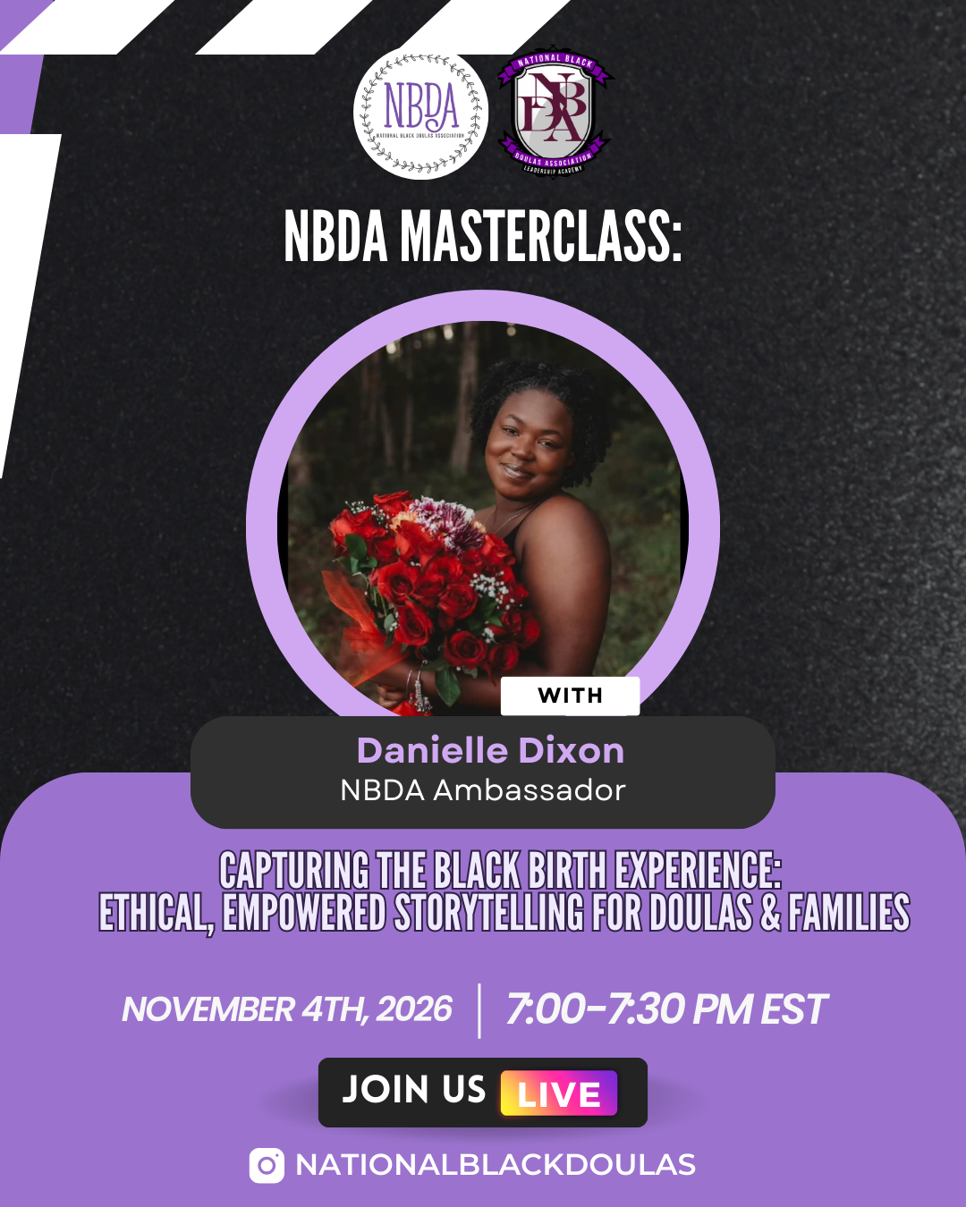 NBDA® Masterclasses are 30-minute, expert-led sessions streamed live on Instagram and YouTube. These sessions are designed to educate, empower, and inform Black families and communities within the birth space. Through accessible, culturally grounded, and evidence-based guidance on maternal health, advocacy, and wellness, we support informed decision-making, uplift trusted voices, and strengthen NBDA®'s leadership in Black maternal health education
