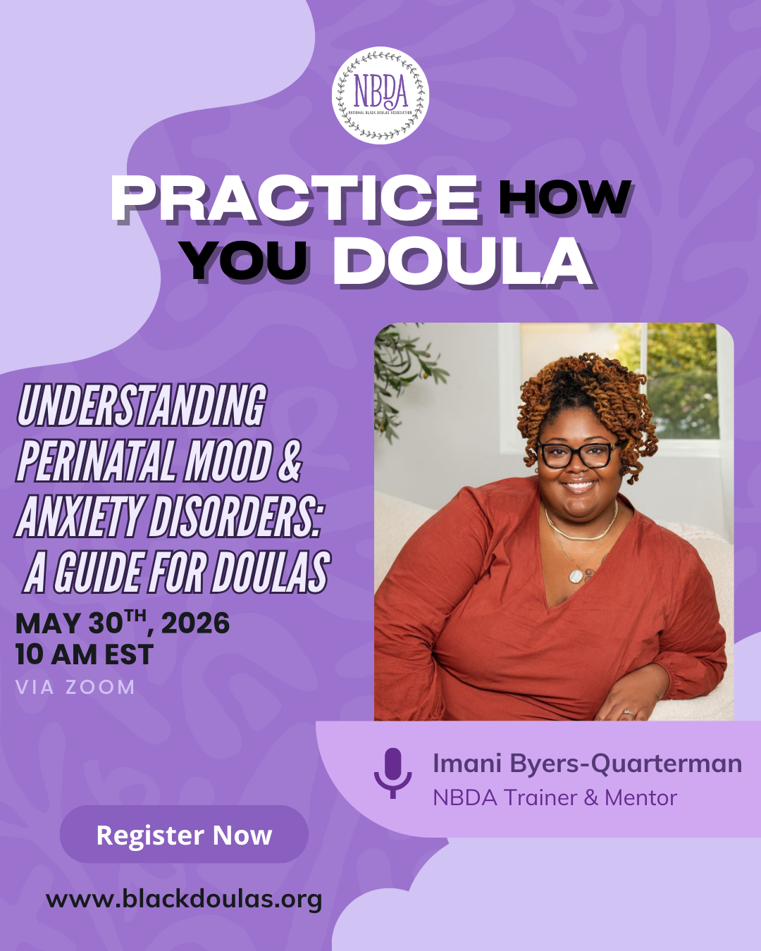 Practice How You Doula is an expert-led, one-hour Zoom workshop focused on building practical skills and confidence in doula care. Each session explores a specific skill or real-life scenario through guided practice and interactive learning, supporting professional growth and peer connection. These workshops help doulas feel better prepared to deliver effective, culturally responsive, and high-quality support to the families they serve.